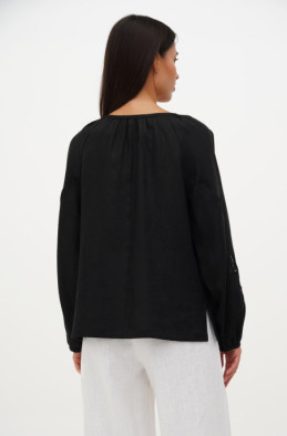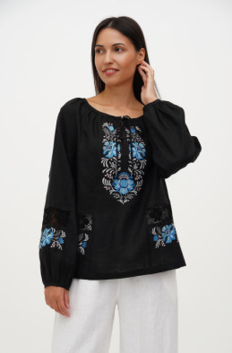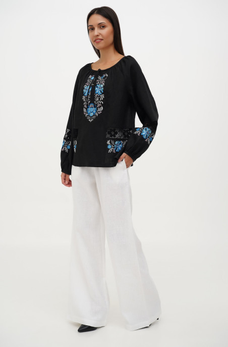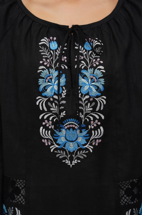 The linen blouse with raglan sleeve for your special events. It is decorated with embroidery and lace. It has no zip.