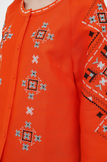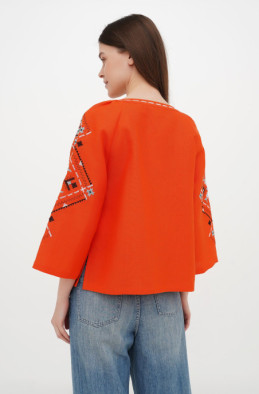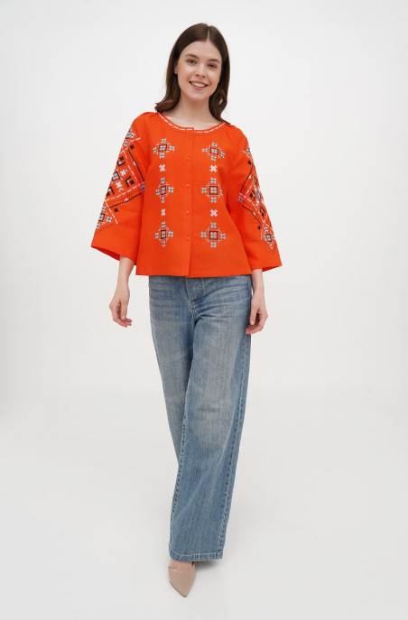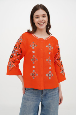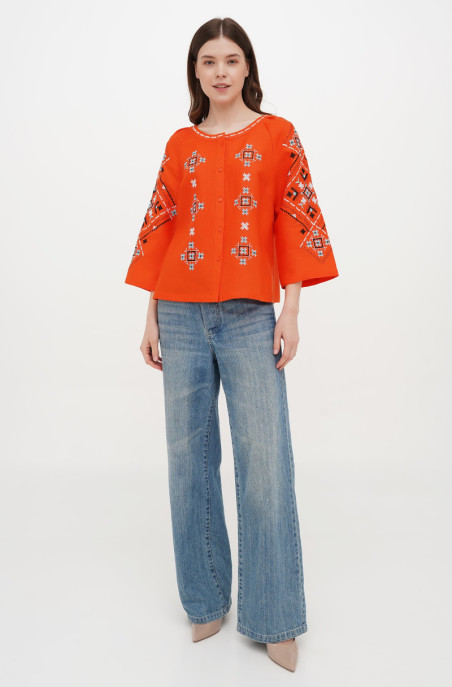 The loose women's linen shirt with embroidery and raglan sleeves. It has buttons on the front.