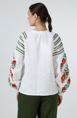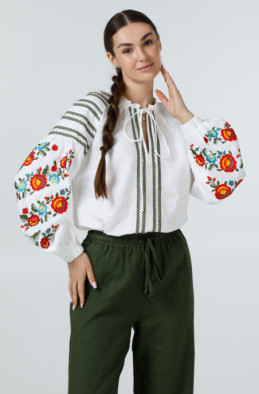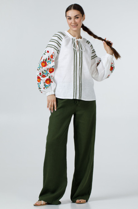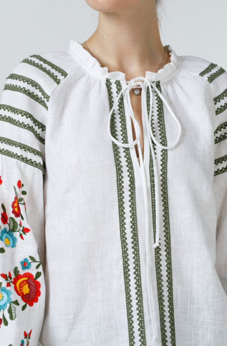 The classic linen blouse. It is decorated with embroidery and thin lace. It has slits in side seams.