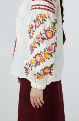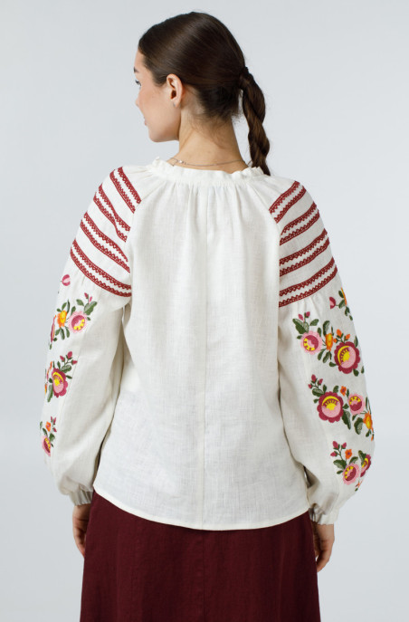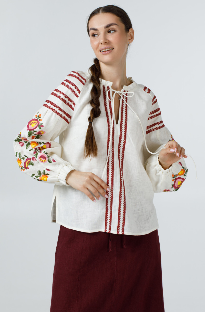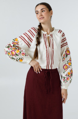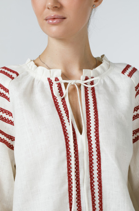 The classic linen blouse. It is decorated with embroidery and thin lace. It has slits in side seams.