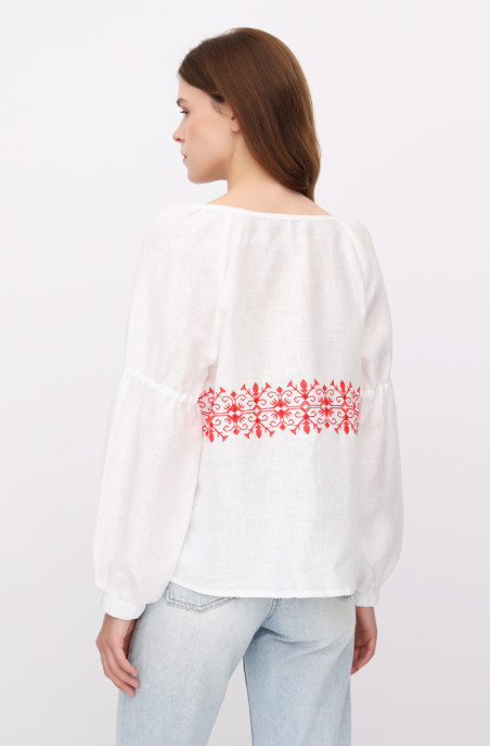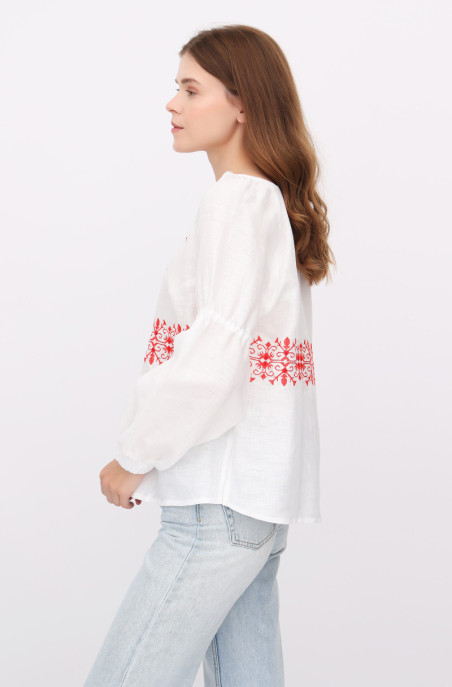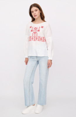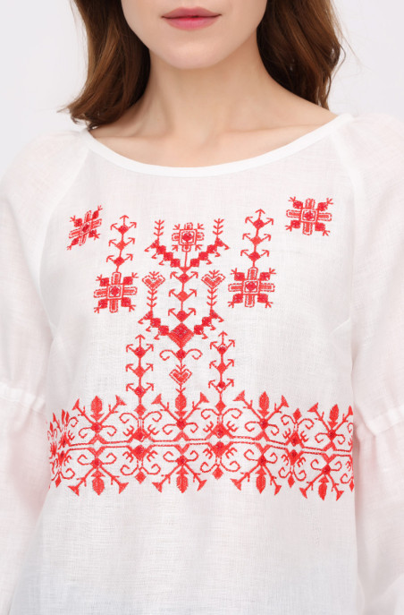 The blouse made of thin linen. It is decorated with embroidery. It has slits in side seams.
