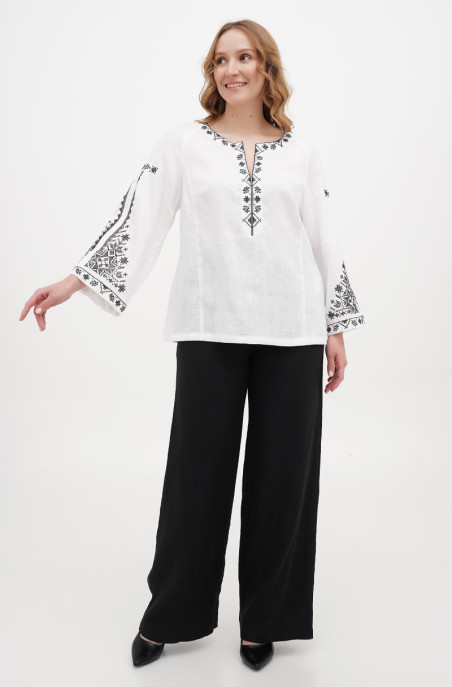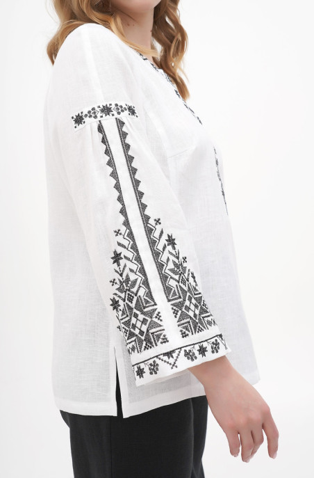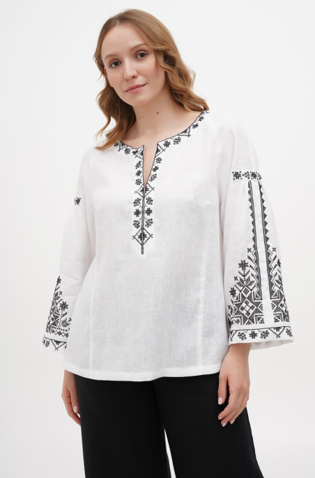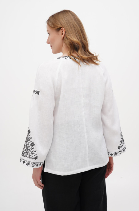 The raglan sleeve blouse made of thin linen. The small slits are in the side seams.