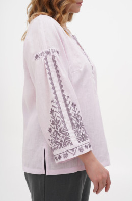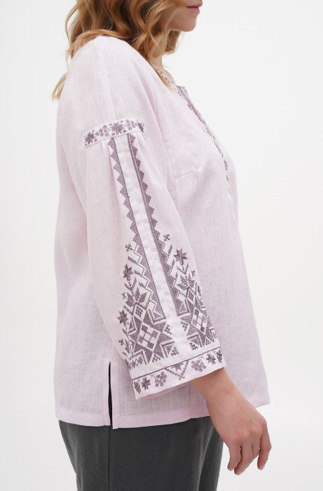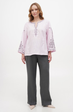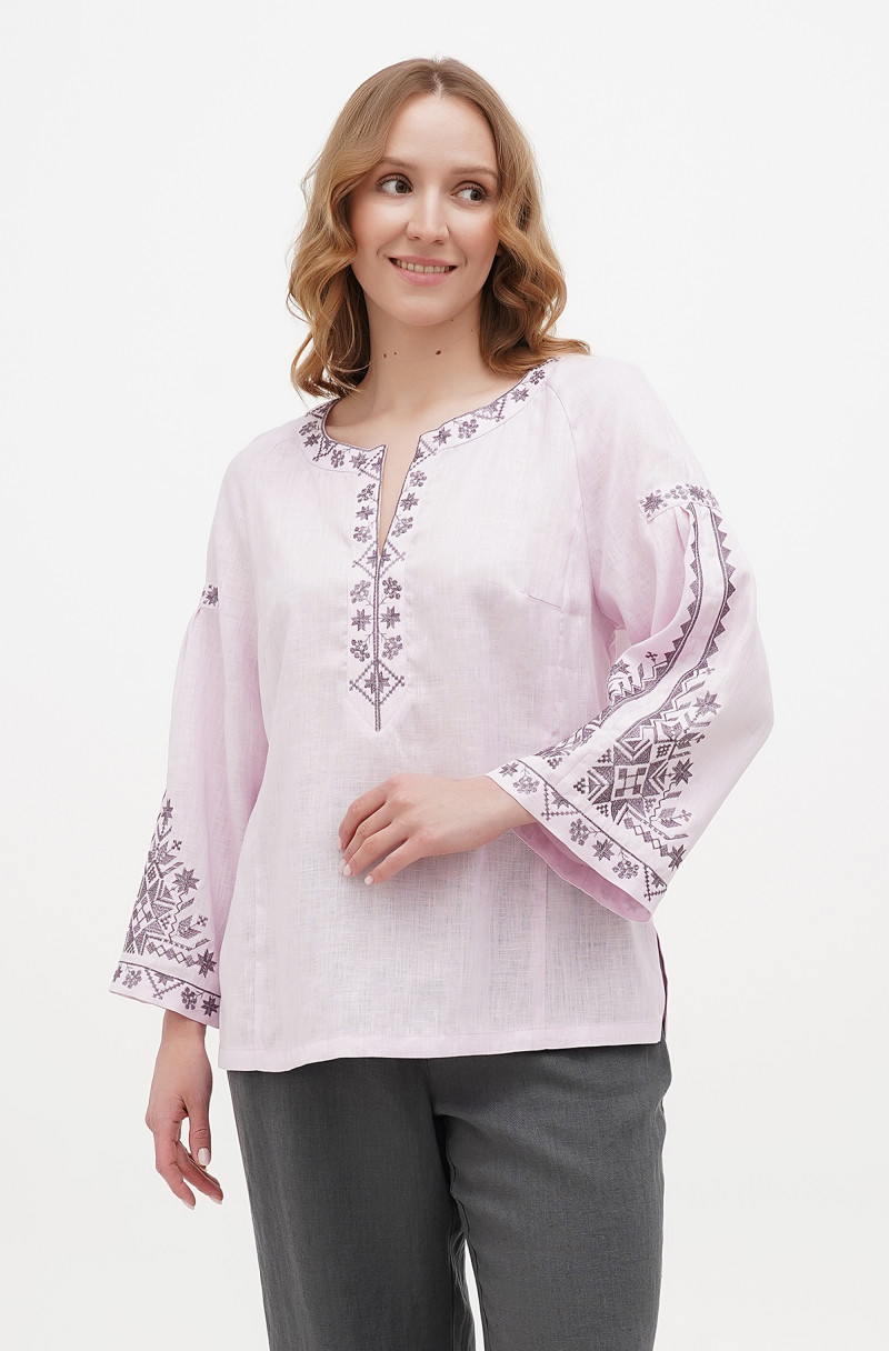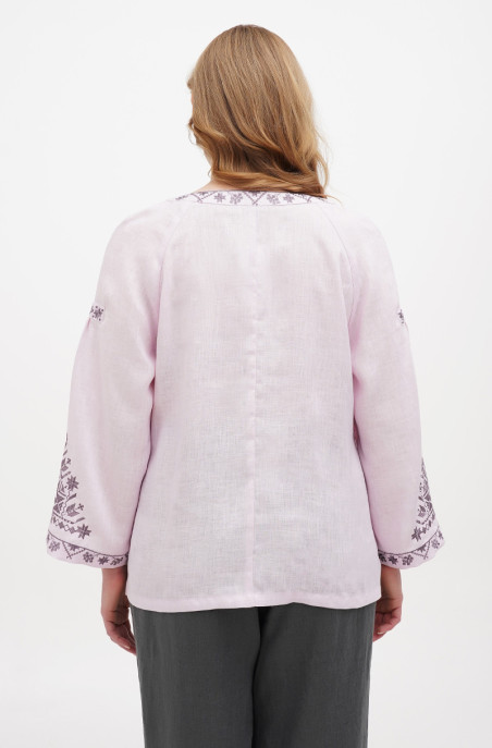 The raglan sleeve blouse made of thin linen. The small slits are in the side seams.