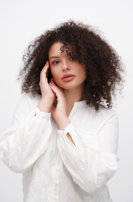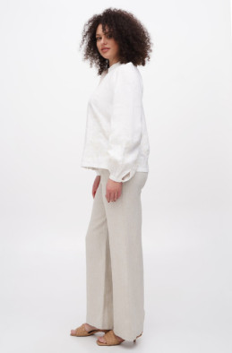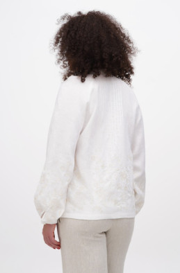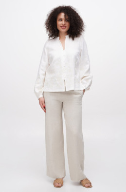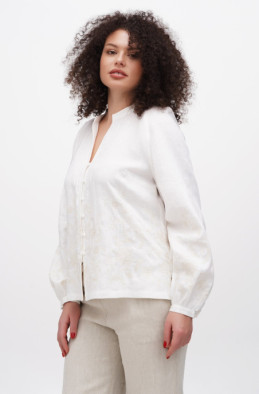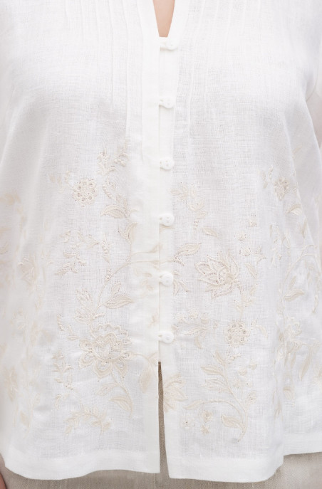 The plus size linen blouse with embroidery. It has buttons and slits in side seams.