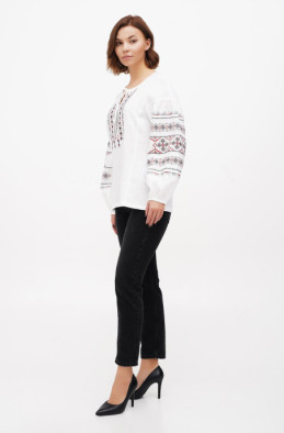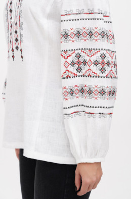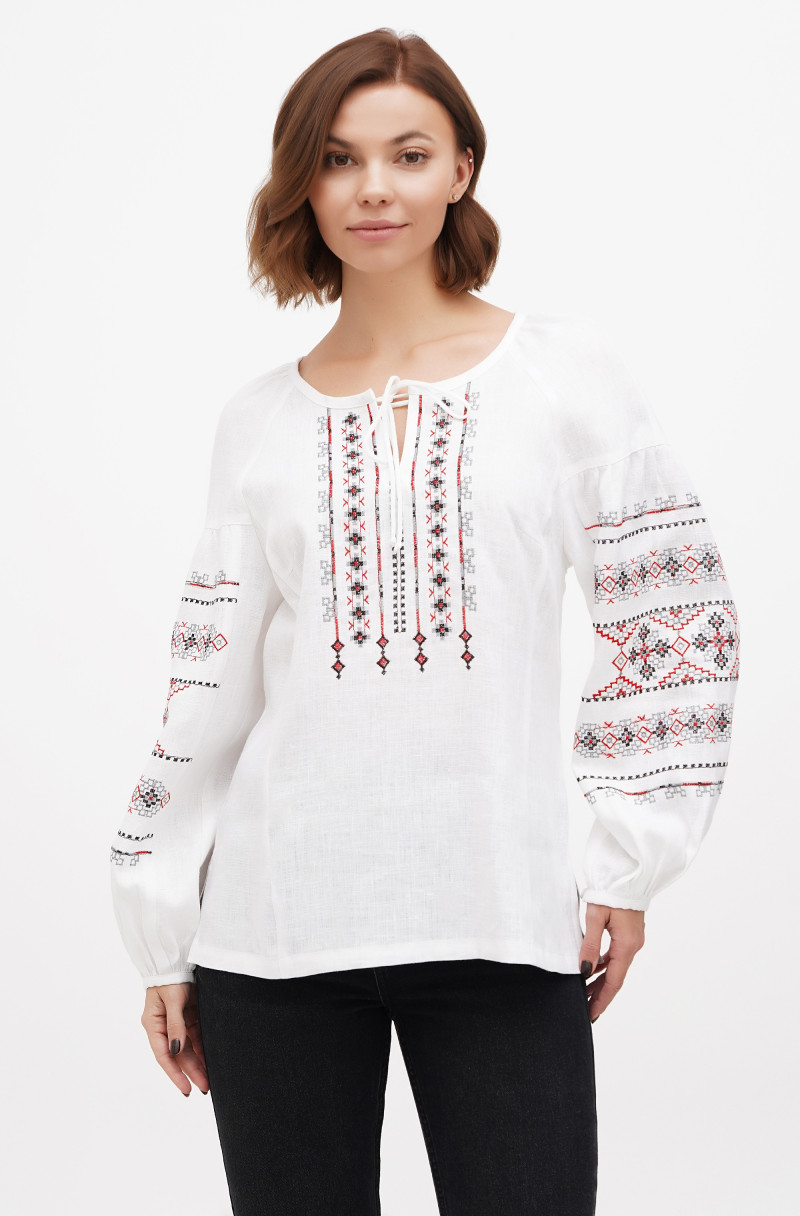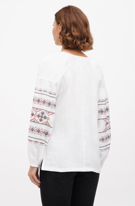 The embroidered blouse made of linen. It has raglan sleeve and no zip.