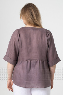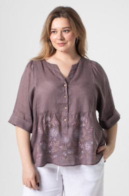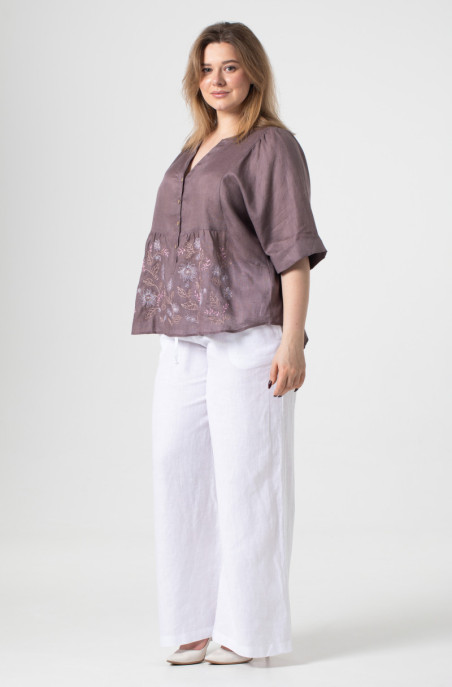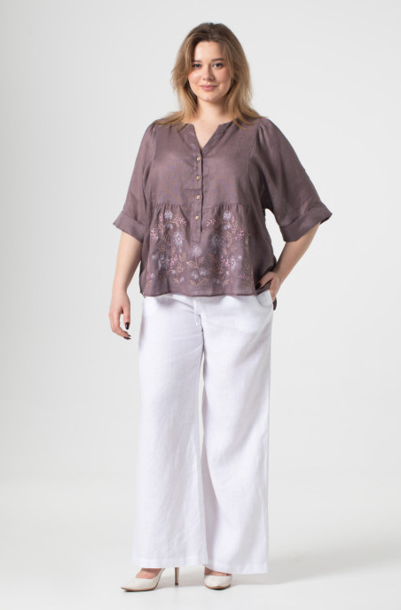 The plus size blouse made of thin linen and decorated with embroidery. The slits are in side seams. It has buttons at the front. (Code 9496/44/1463)
