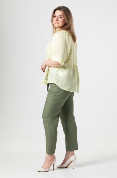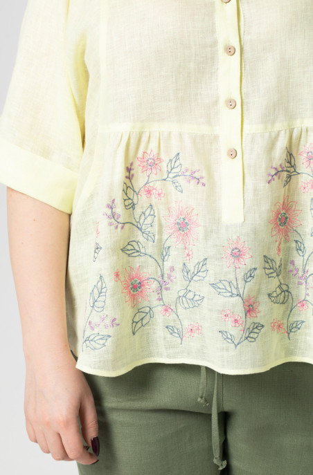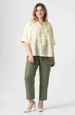 The plus size blouse made of thin linen and decorated with embroidery. The slits are in side seams. It has buttons at the front. (Code 9496/44/1603)