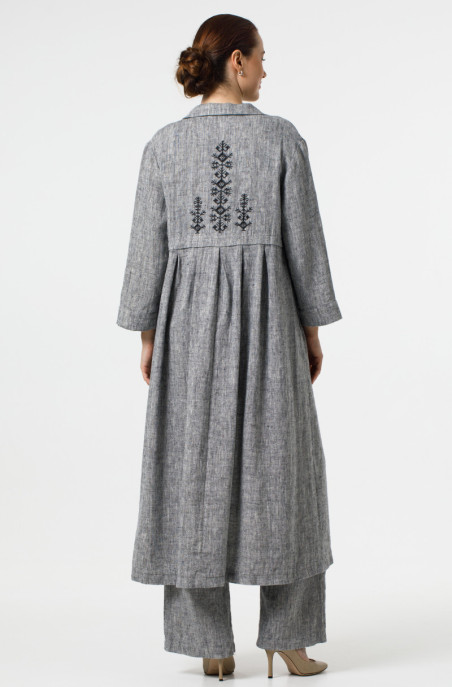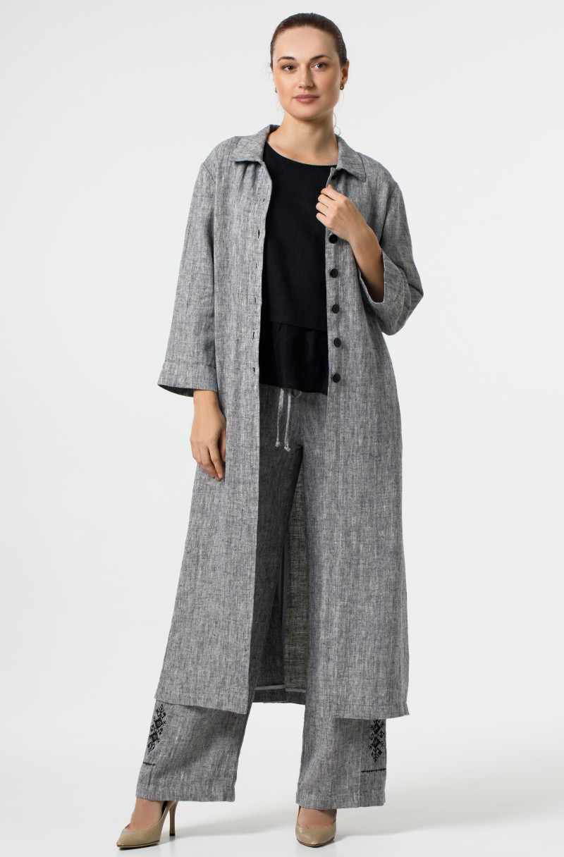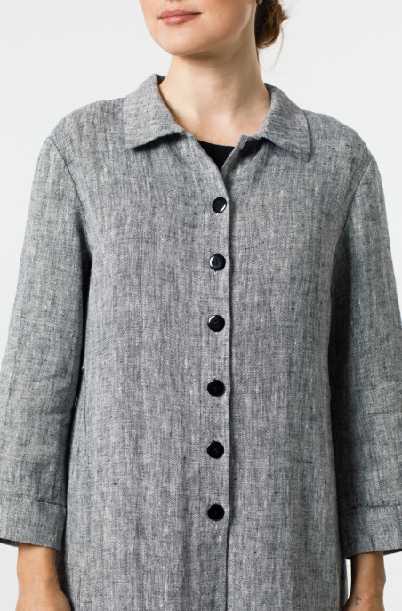 The thick linen coat with buttons. It is without lining. The coat has pockets in side seams.