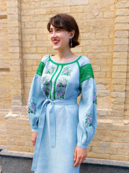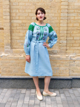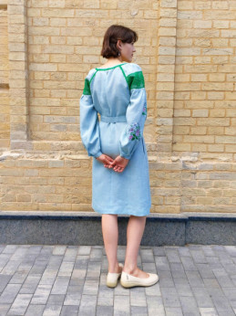 The linen dress with embroidery and lace. There are pockets in side seams and zip on the back.