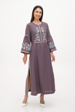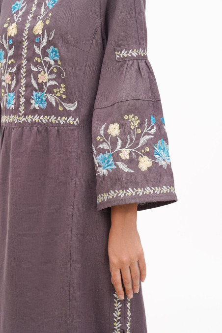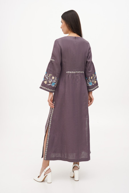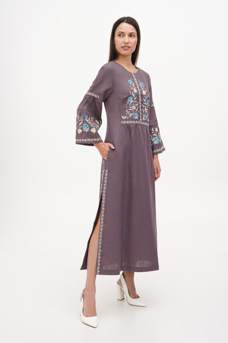 The long Provence style dress with embroidery. The pockets are in side seams. It has zip on the back.