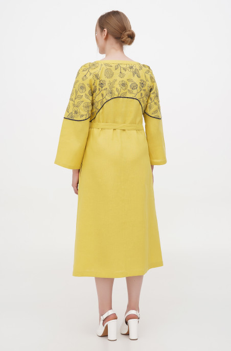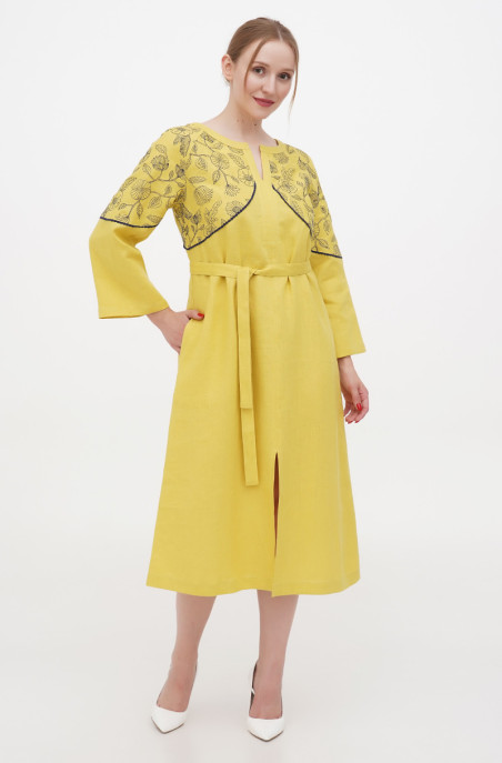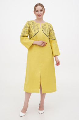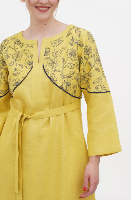 The plus size linen dress with embroidery, slit, pockets and raglan sleeves. Can be worn with belt. It has no zip.