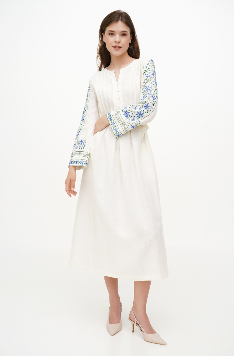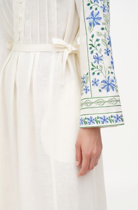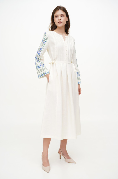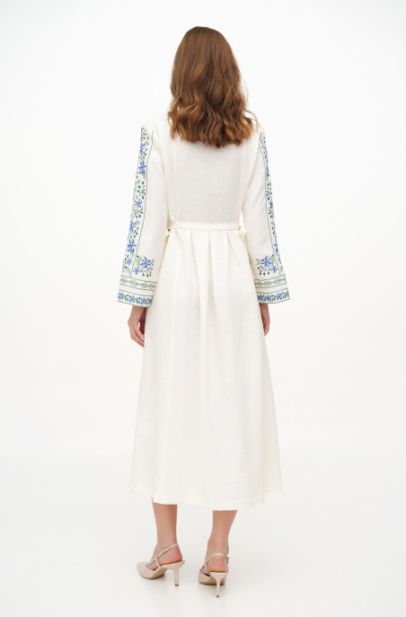 The linen dress with embroidery. Four belts adjust the waist fit. There are pockets in side seams. It has no zip.