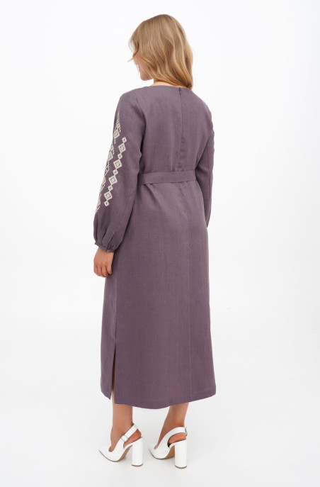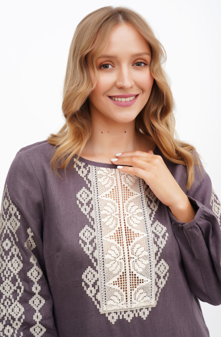 The linen dress with embroidery and lace. There are pockets and slits in side seams. It has a zip.