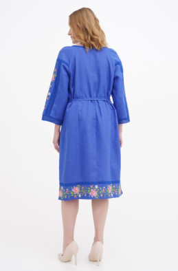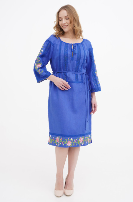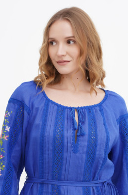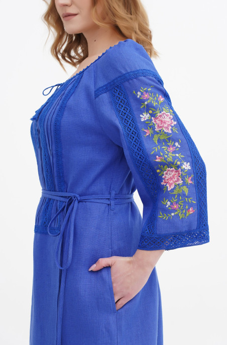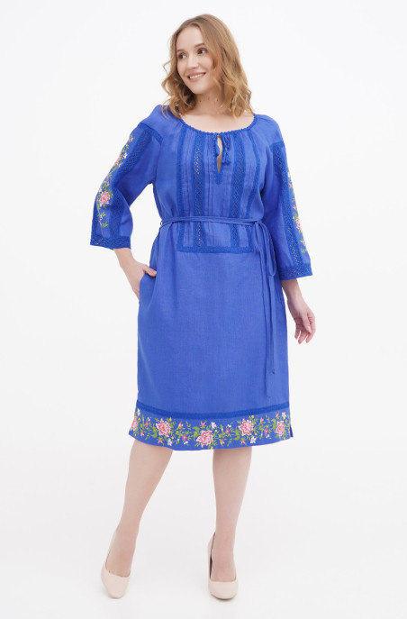 The straight fit dress with lace and floral embroidery. It has pockets in side seams and waist belt.