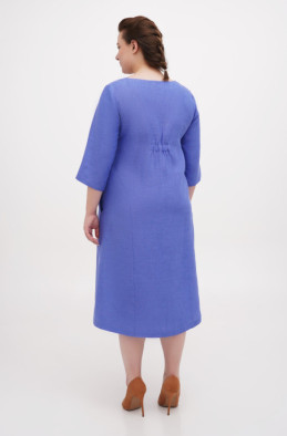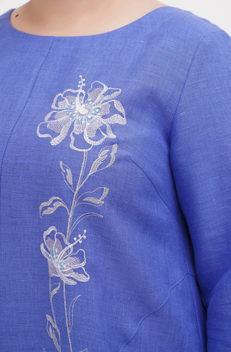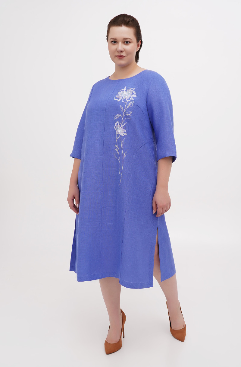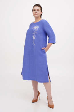 The plus size linen dress with embroidery. There are pockets and slits in side seams. It has no zip.