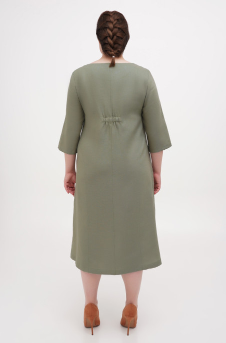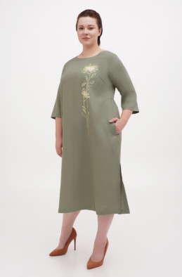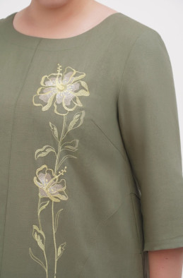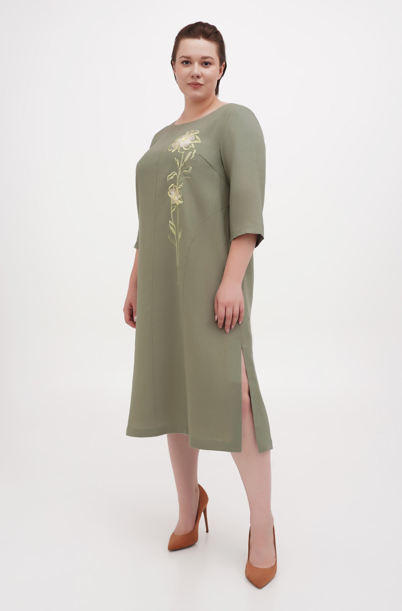 The plus size linen dress with embroidery. There are pockets and slits in side seams. It has no zip.