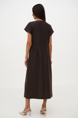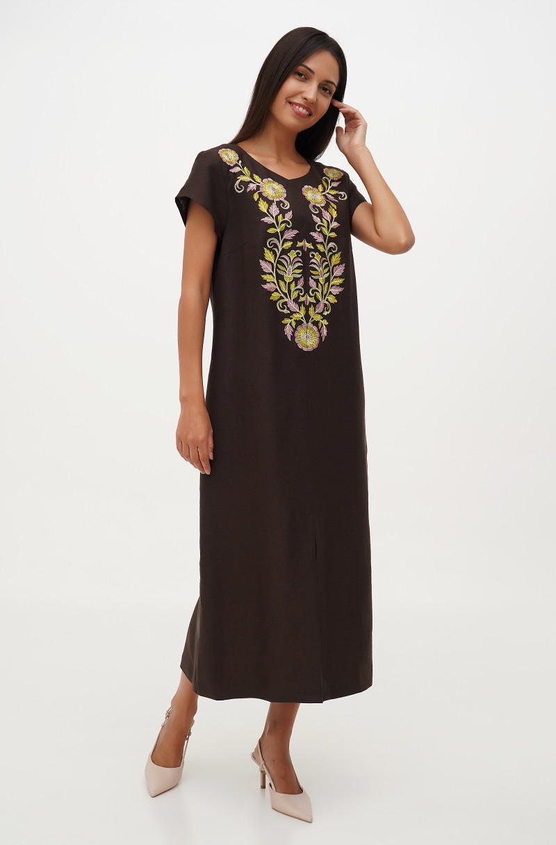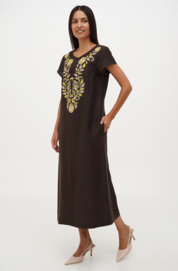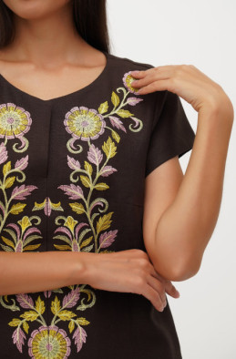The linen dress with embroidery. There are pockets in side seams. It has a zip on the back.