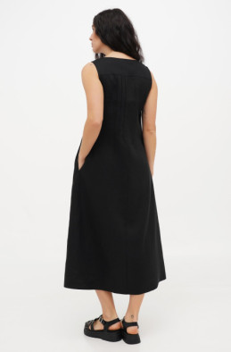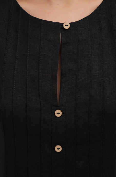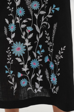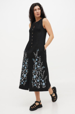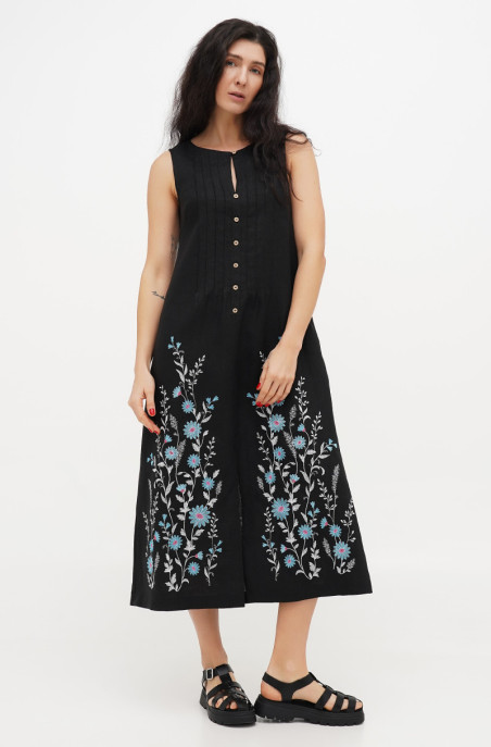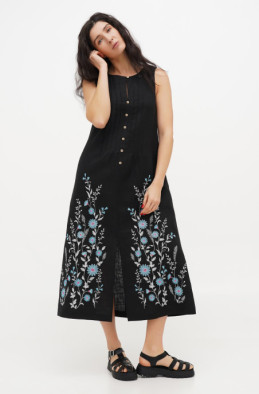 The linen dress decorated with embroidery and buttons. It has pockets in side seams and no zip.
