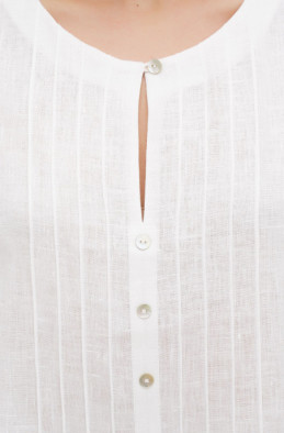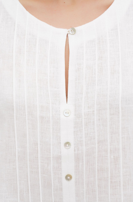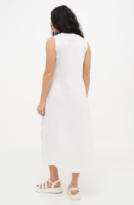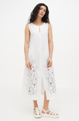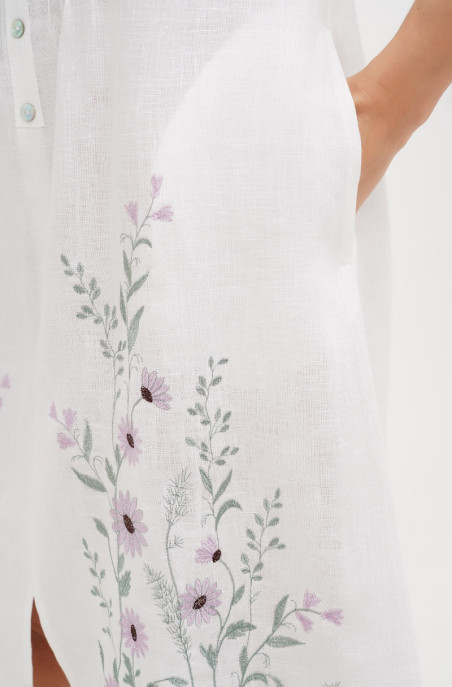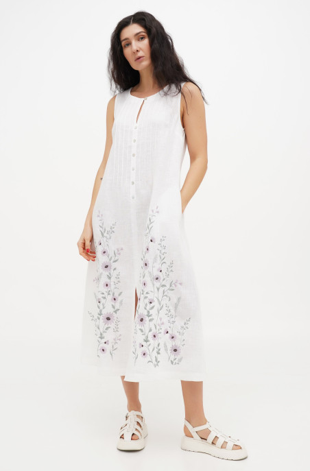 The linen dress decorated with embroidery and buttons. It has pockets in side seams and no zip.