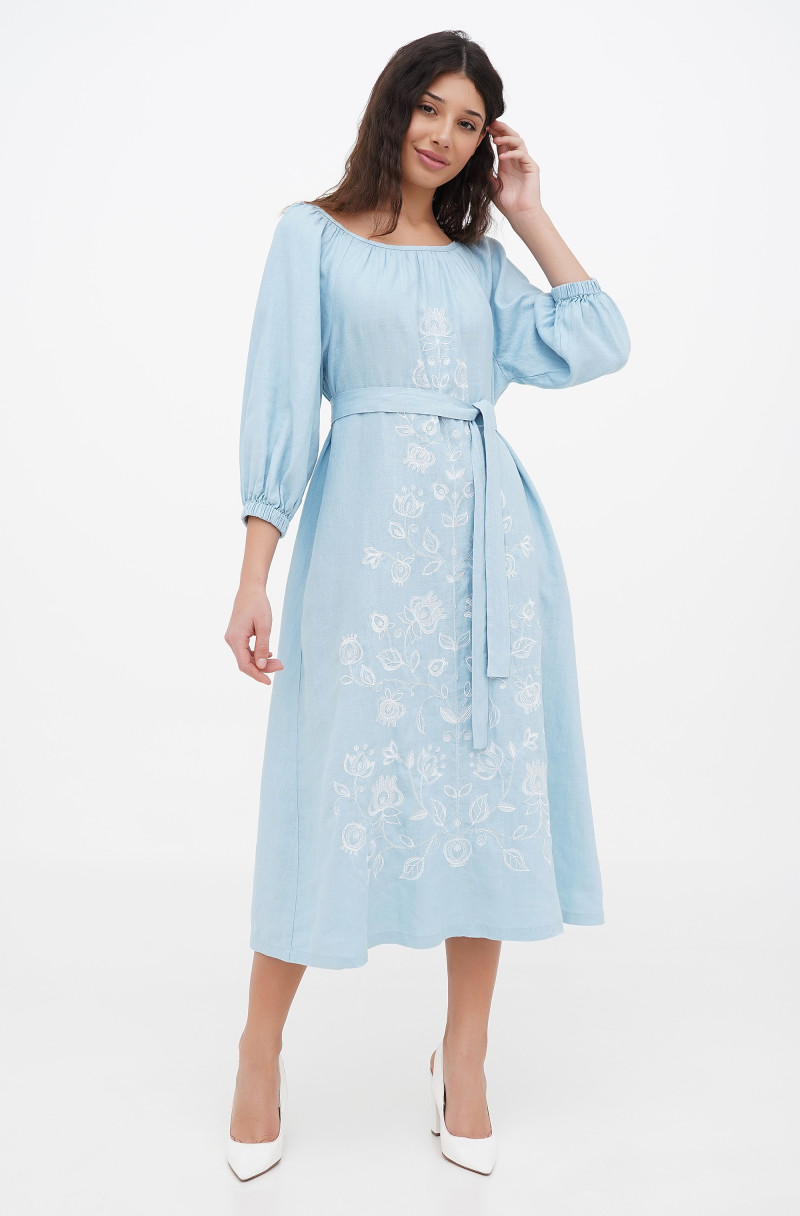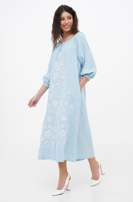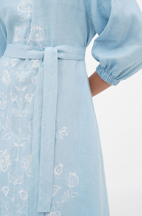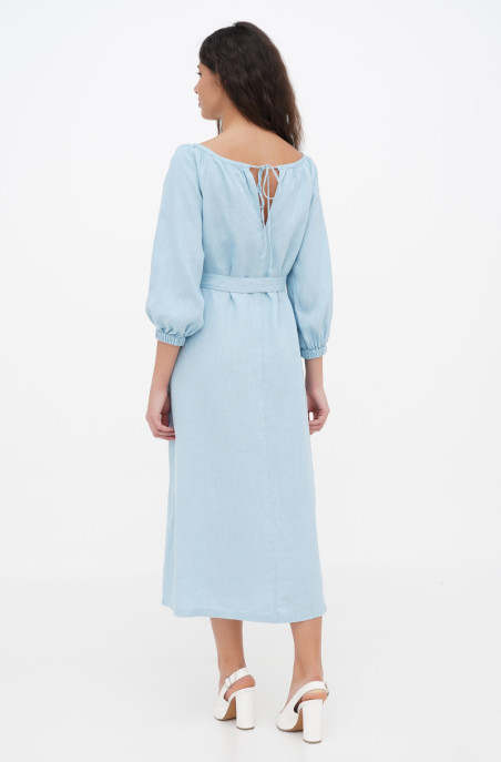 The softened linen dress with raglan sleeve and pockets in side seams. It has a waist belt.