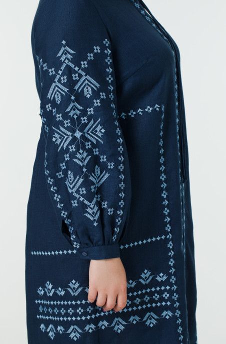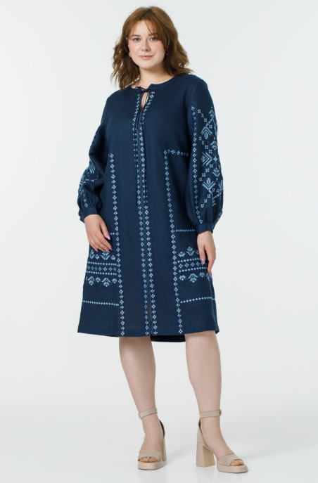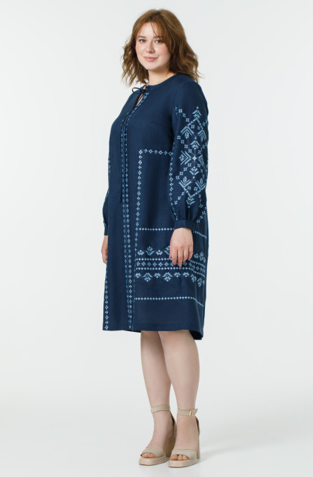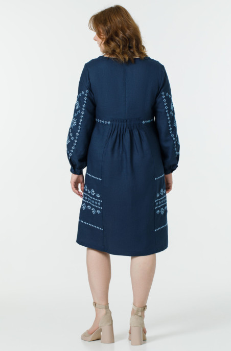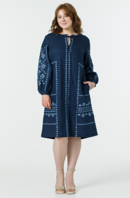 The plus size linen dress, decorated with embroidery. It has a zip on the back and pockets in side seams.