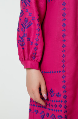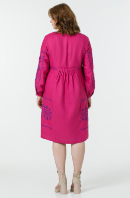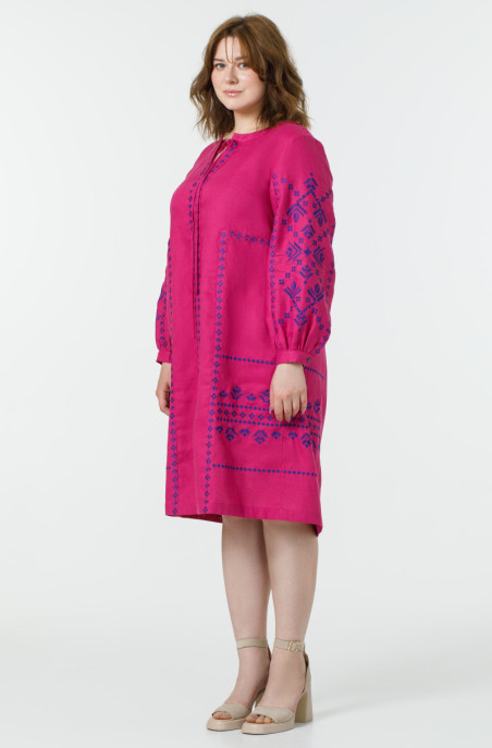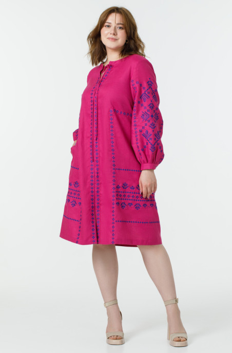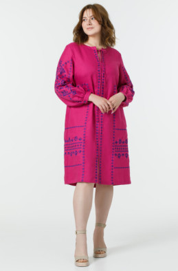 The plus size linen dress, decorated with embroidery. It has a zip on the back and pockets in side seams.