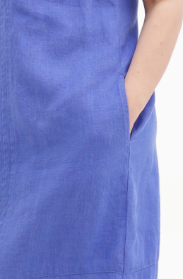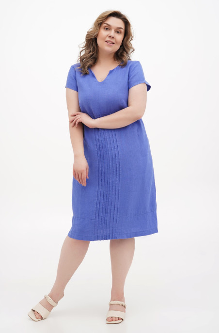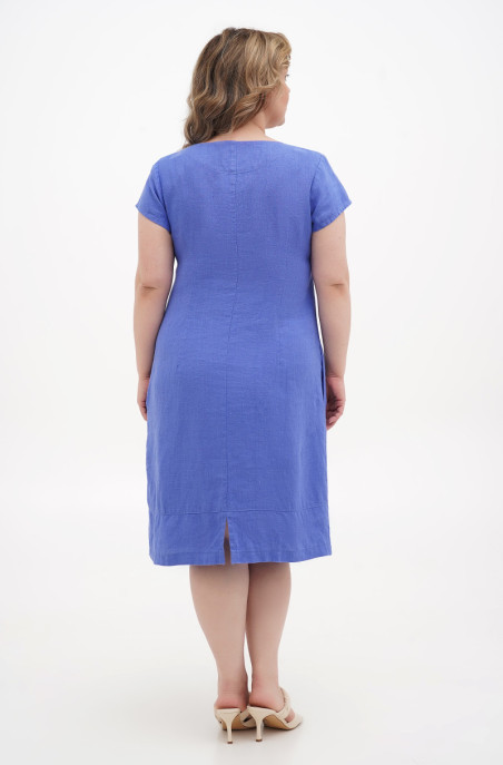The plus size dress made of softened linen. There are pockets in side seams. It has no zip.