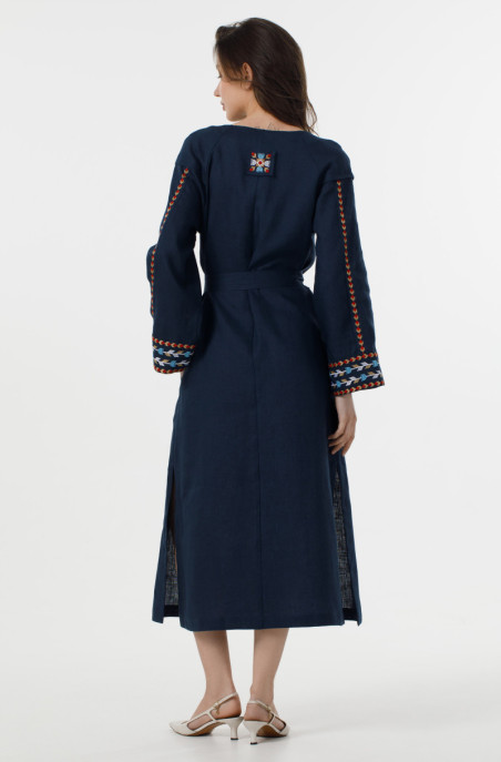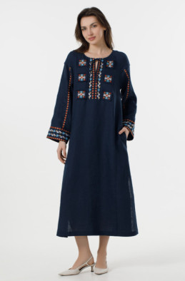 The linen dress decorated with embrodiery. It has pockets in side seams. It has no zip. It has a waist belt. (Code 0492/42/999)