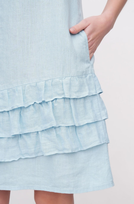 The linen dress decorated with rows of thin linen ruffles at the bottom. It has pockets in side seams. It has no zip. (Code 00028/42/1305)
