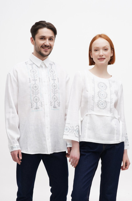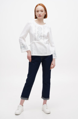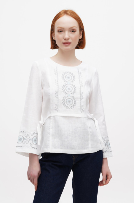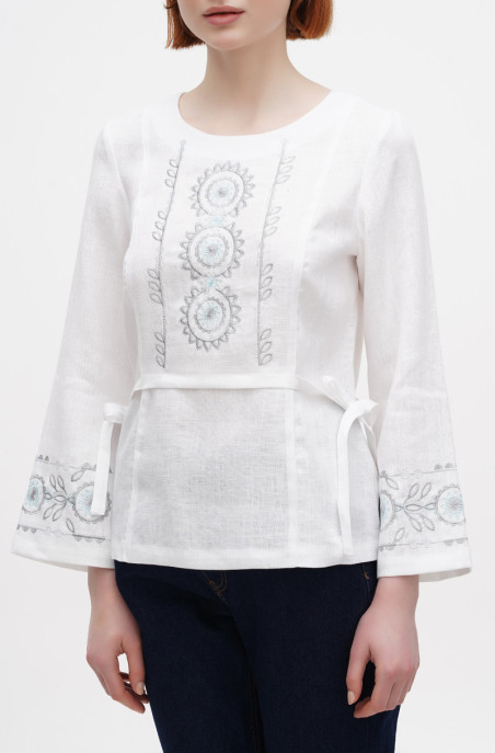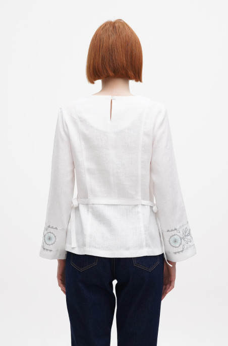 The linen blouse with embroidery. The blouse is tied at the sides with 4 half-belts. It has one button on the back.