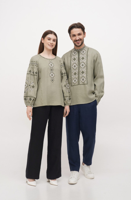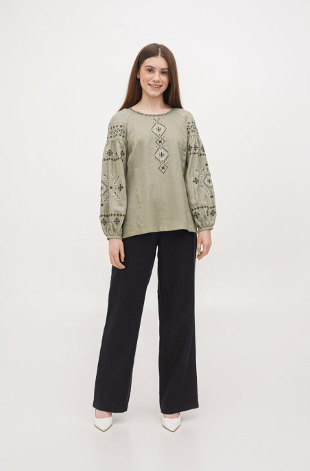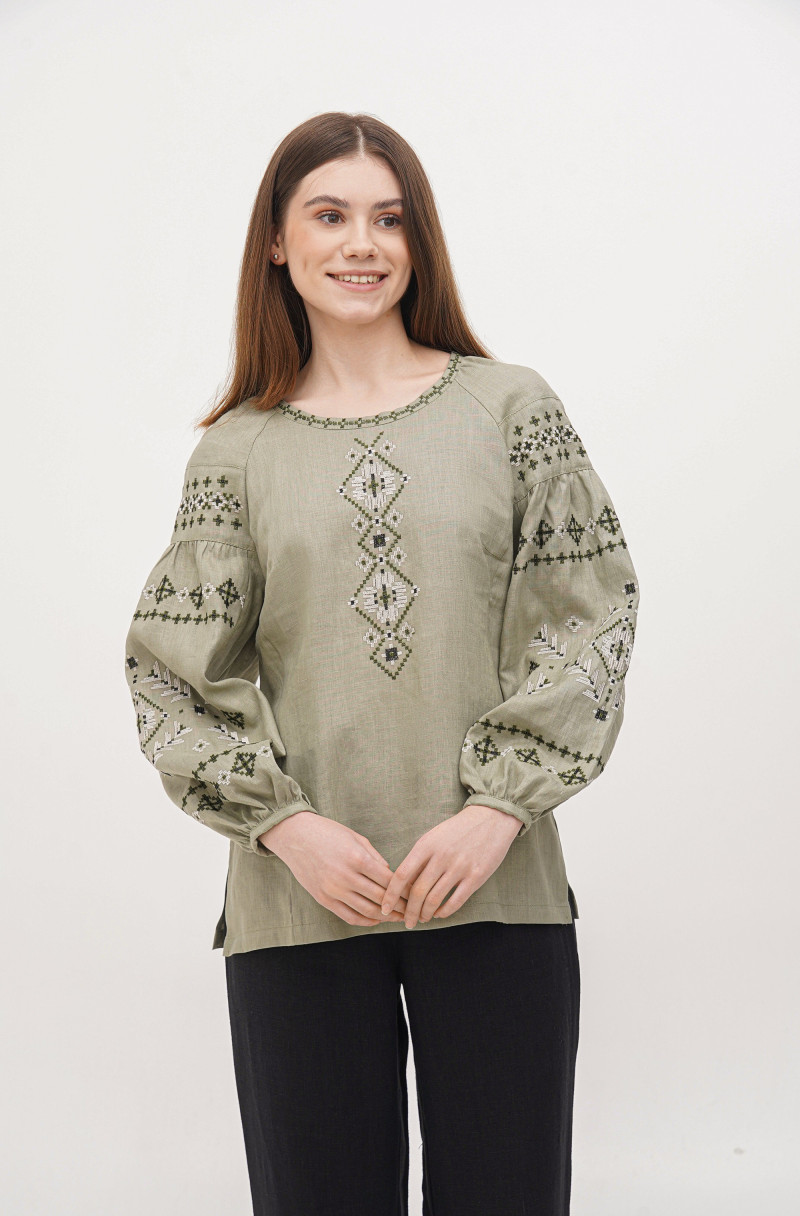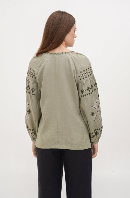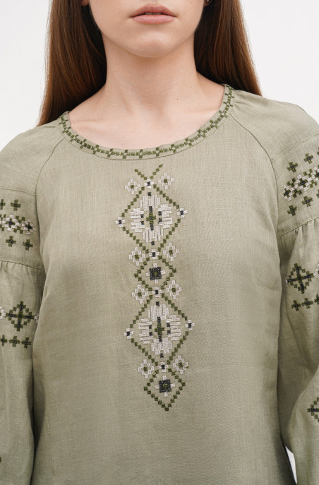 The embroidered blouse made of linen. It has raglan sleeve and no zip.