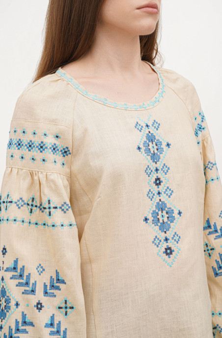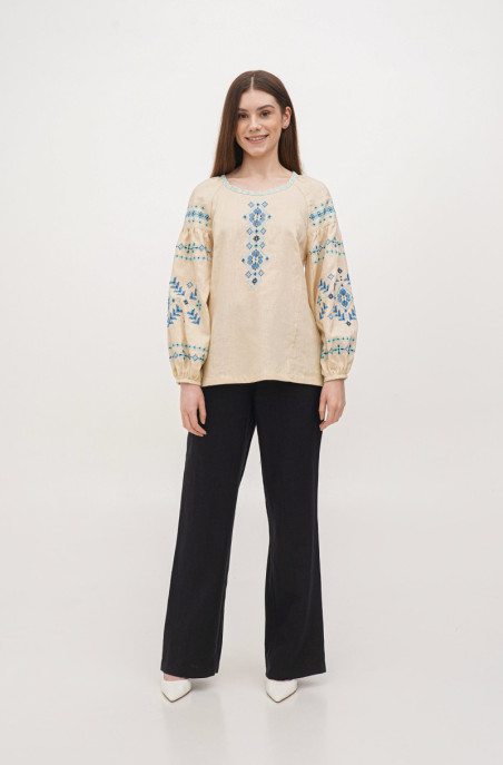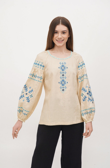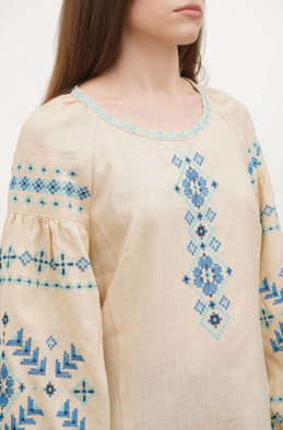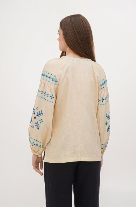 The embroidered blouse made of linen. It has raglan sleeve and no zip.