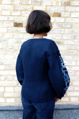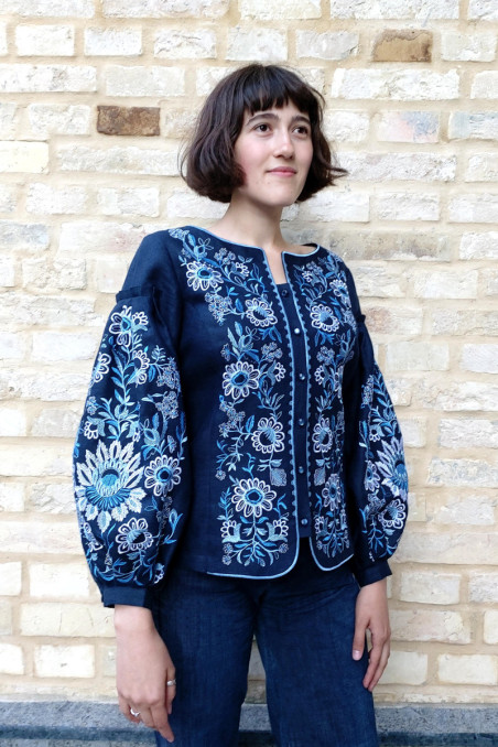 The tight fit linen blouse with floral embroidery. It has voluminous sleeve and buttons on the front.
