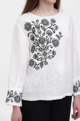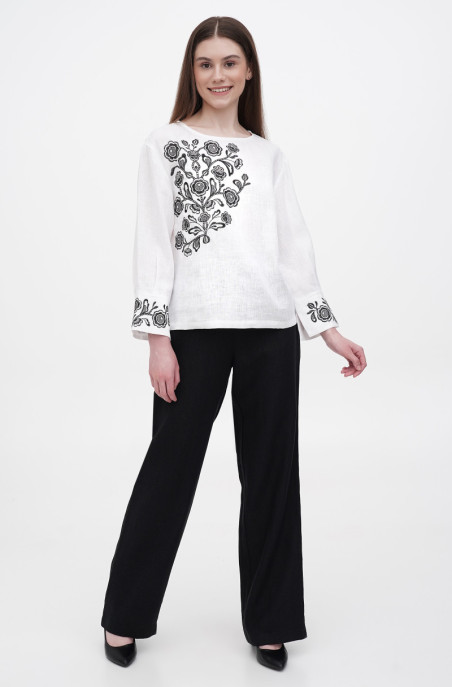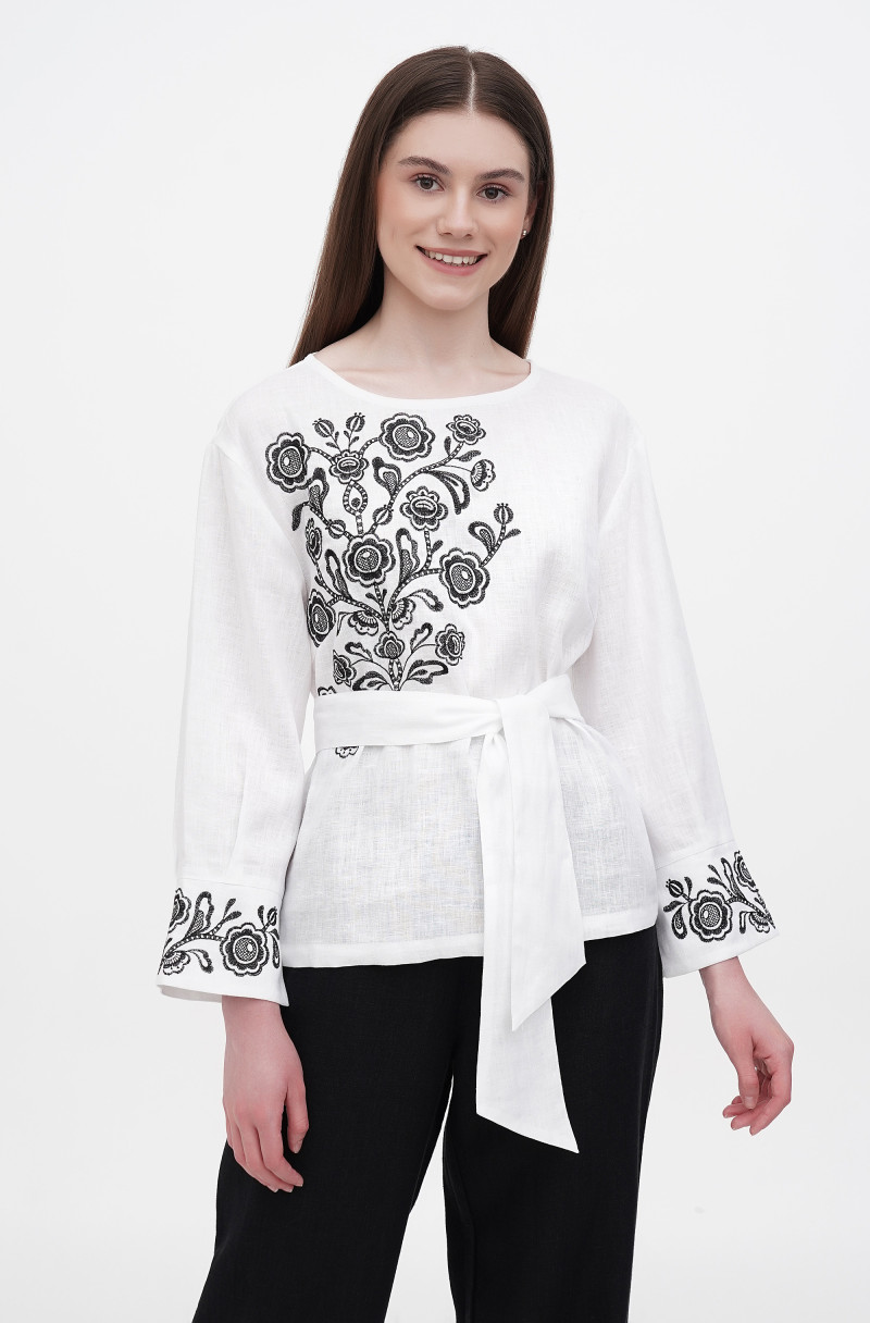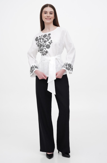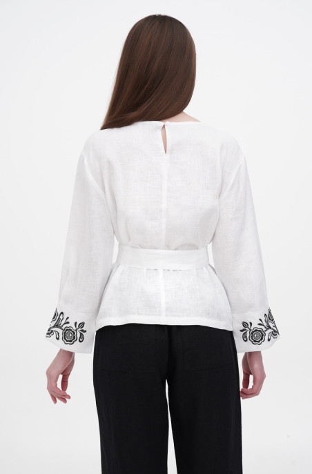 The soft linen blouse with embroidery. It has one button on the back. It looks good with wide belt.