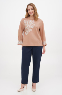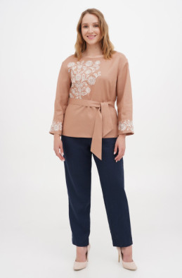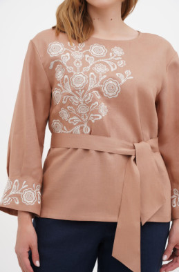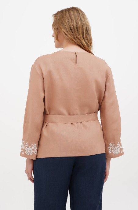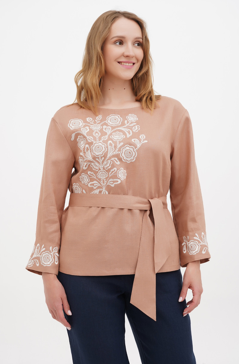 The soft linen blouse with embroidery. It has one button on the back. It looks good with wide belt.