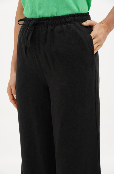 The mid-waist pants made of thick linen. They have elastic band with cord, pockets and no zip.
