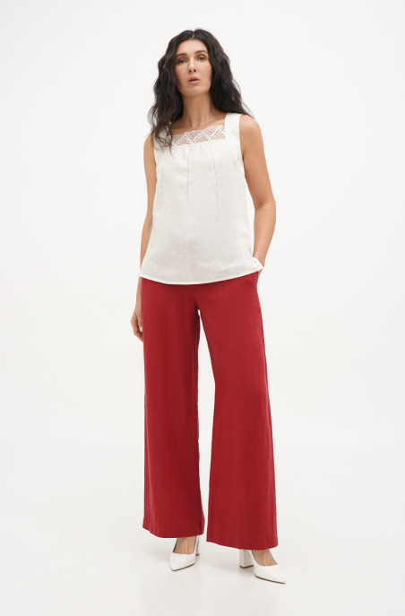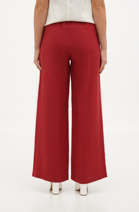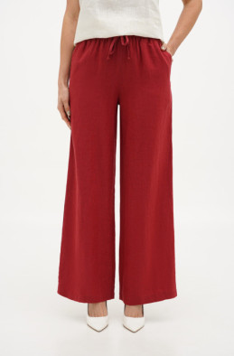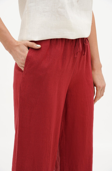 The mid-waist pants made of thick linen. They have elastic band with cord, pockets and no zip.