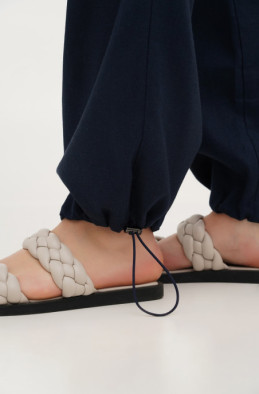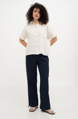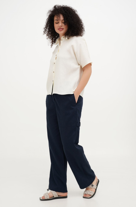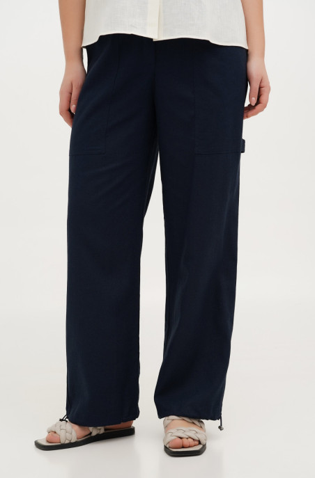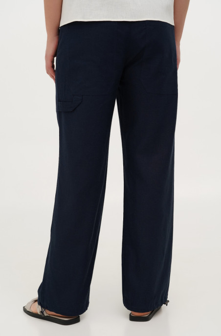 The pants made of thick linen/viscose fabric. They have elastic band, pockets and a zip at the front.