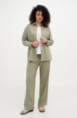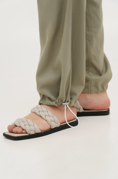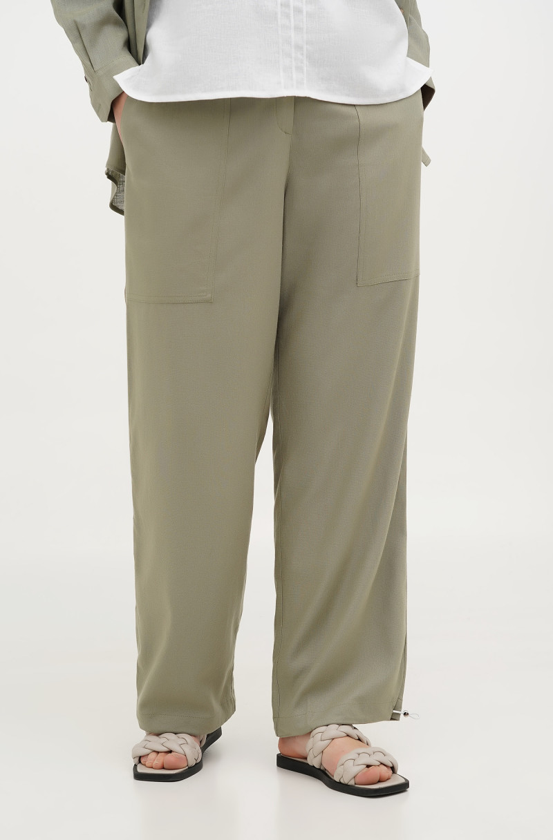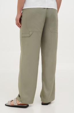 The pants made of thick linen/viscose fabric. They have elastic band, pockets and a zip at the front.