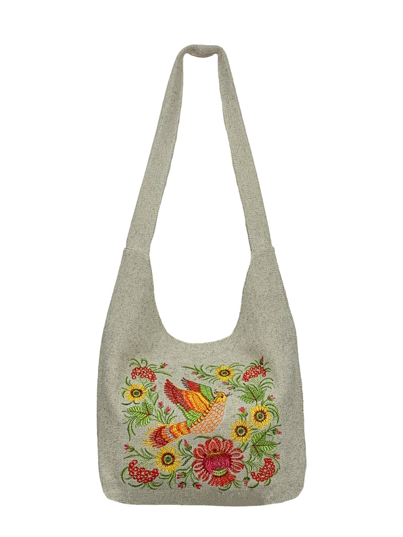 Сумка с вышивкой изготовлена из прочной ткани, которая по своим свойстам приравнивается к мебельной или обувной. Она крепкая на разрыв, стойкая к протираниям, отлично держит форму и рассчитана на длительное интенсивное использование. Сумку можна стирать при температуре до 30 градусов без замачивания. Внутри сумки есть подкладка и внутренний карман. Сумка застегивается на молнию.