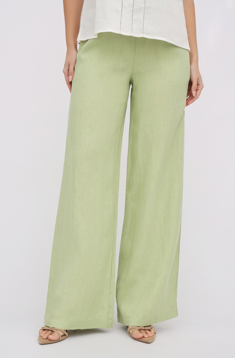 Свободные брюки из льна средней плотности с эффектом крэш имеют среднюю посадку по талии. По поясу брюк вставлена резинка и шнур для завязки, застёжки-молнии нет. Брюки прилегающие вверху и расширенные к низу. Боковые карманы по переду. (Код 80021/42/101)