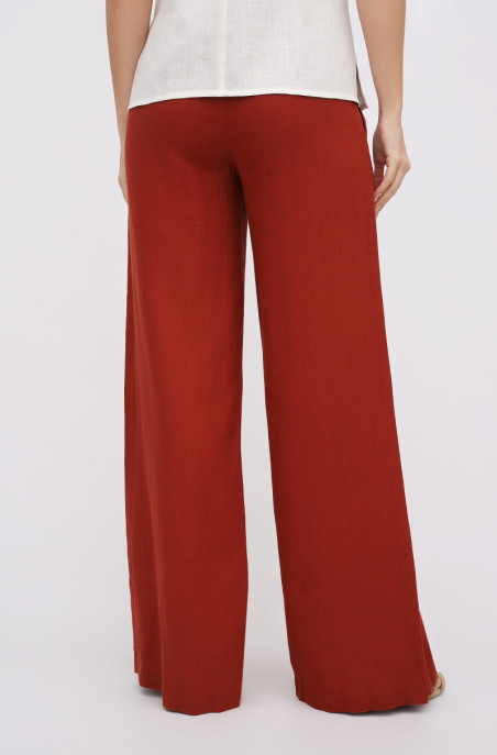 Свободные брюки из льна средней плотности с эффектом крэш имеют среднюю посадку по талии. По поясу брюк вставлена резинка и шнур для завязки, застёжки-молнии нет. Брюки прилегающие вверху и расширенные к низу. Боковые карманы по переду. (Код 80021/42/0779)