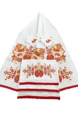 В комплект включены рушники и салфетки, необходимые при обряде венчания в церкви. Все изделия украшены тематической вышивкой и кружевами. Пошиты из полульняной ткани.