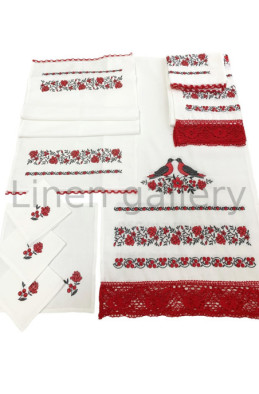 В комплект включены рушники и салфетки, необходимые при обряде венчания в церкви. Все изделия украшены тематической вышивкой и кружевами. Пошиты из полульняной ткани.