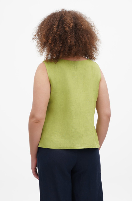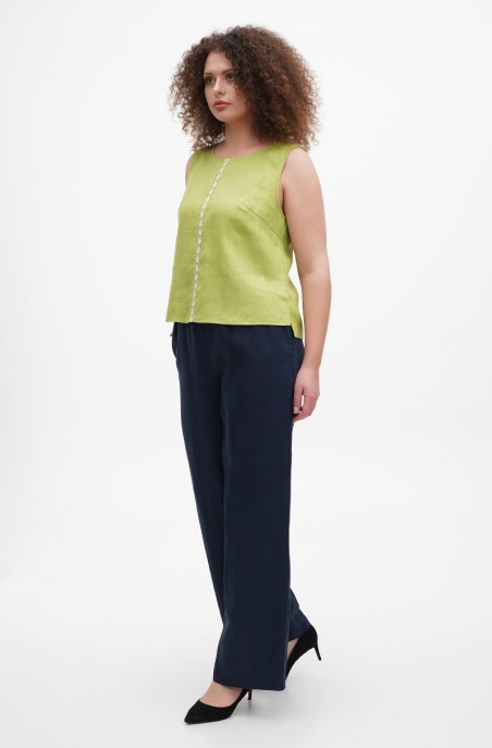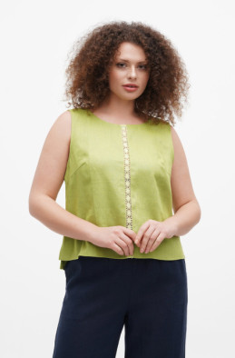 Блуза з льону по пілці прикрашена мереживом. По бічних швах розрізи, спинка трохи довша за перед. Блуза без застібки.