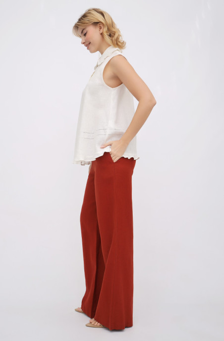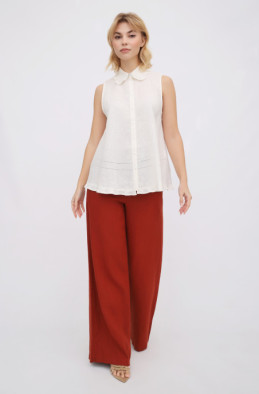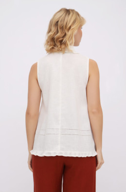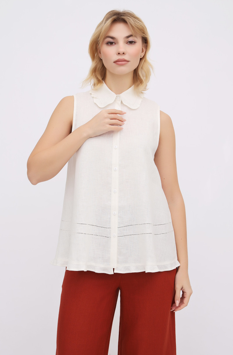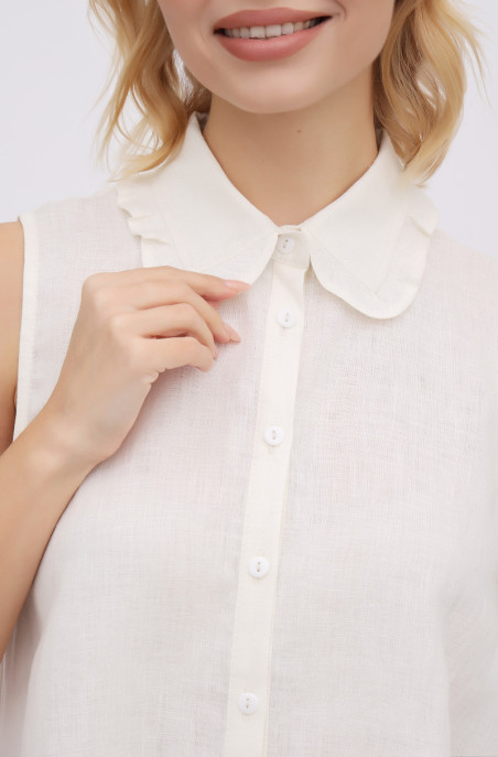 Вільна блуза з тонкого льону А-подібного силуету. Блуза прикрашена рюшами і мережкою. Застібка спереду на ґудзики.