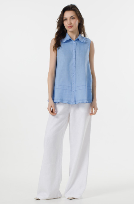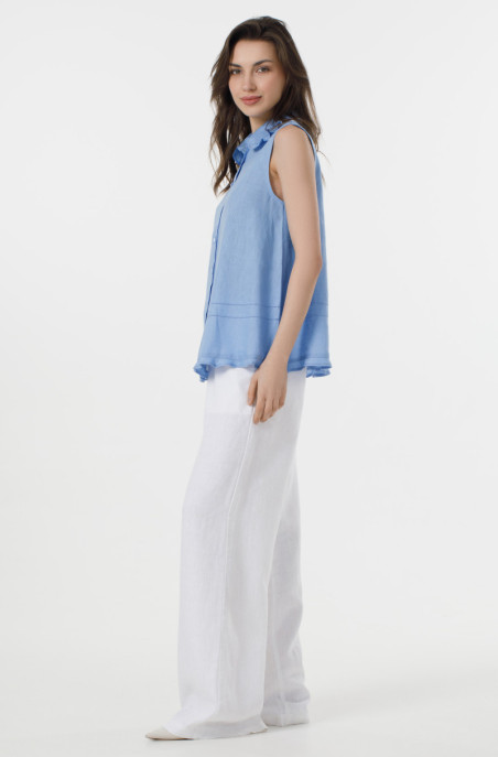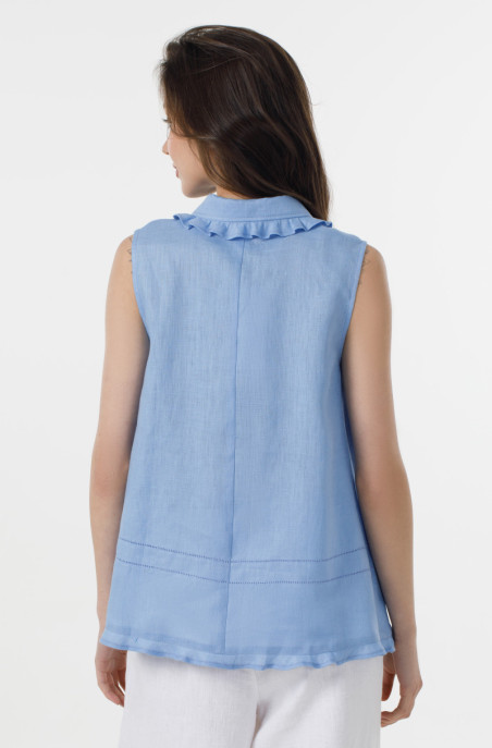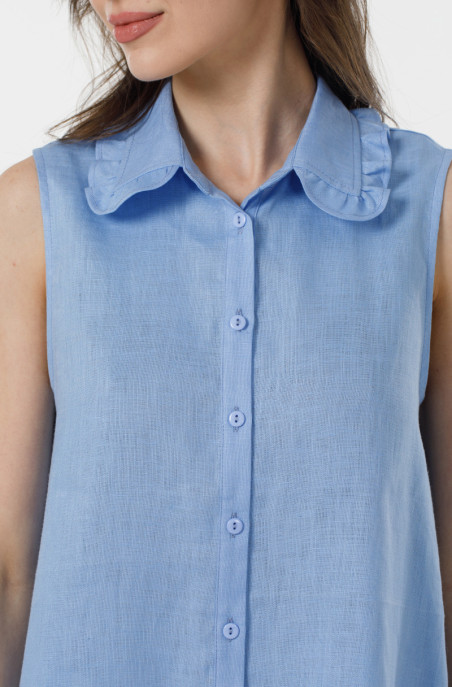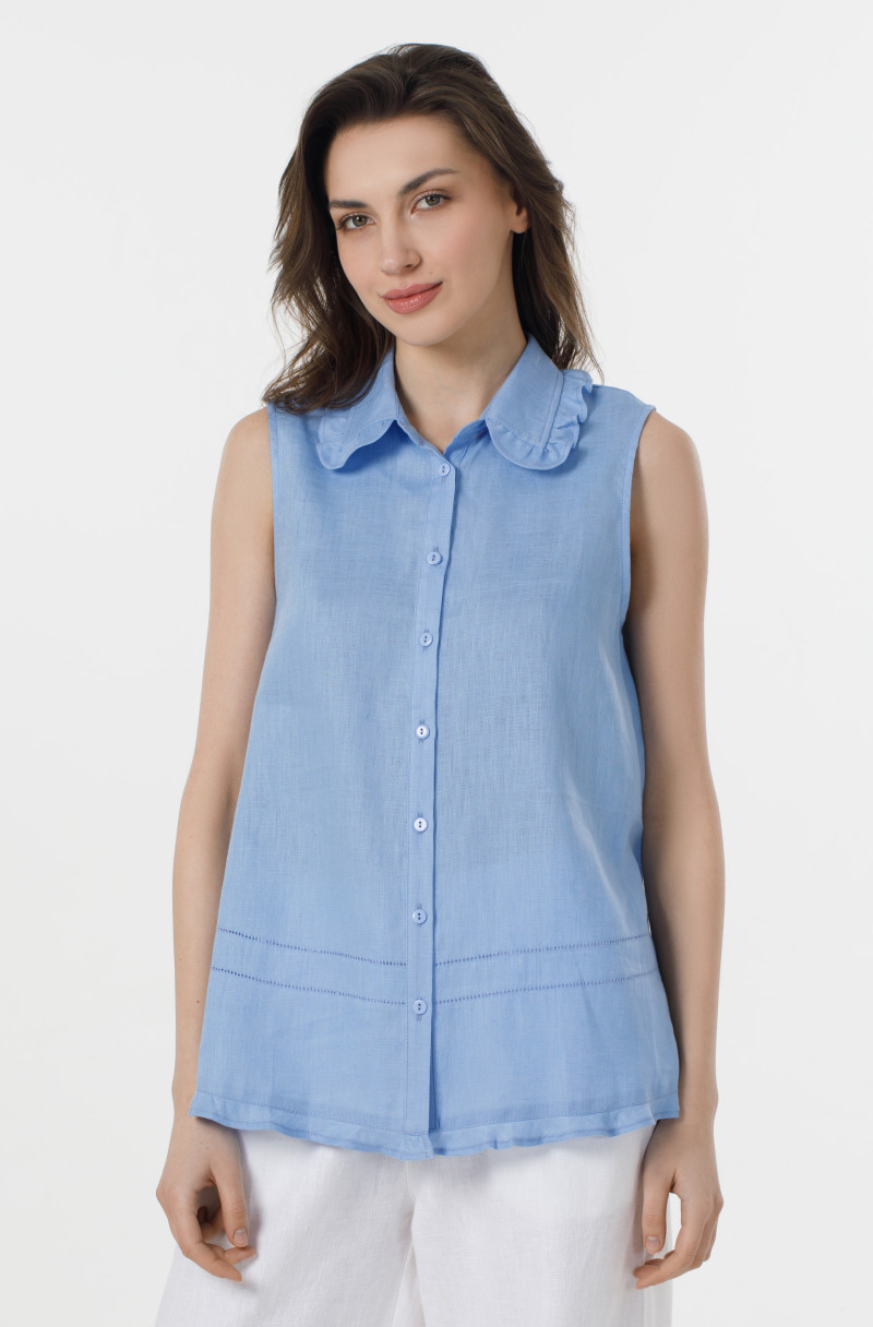 Вільна блуза з тонкого льону А-подібного силуету. Блуза прикрашена рюшами і мережкою. Застібка спереду на ґудзики.