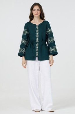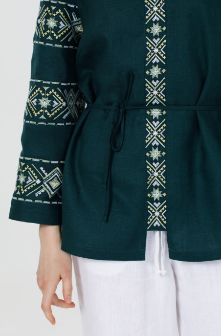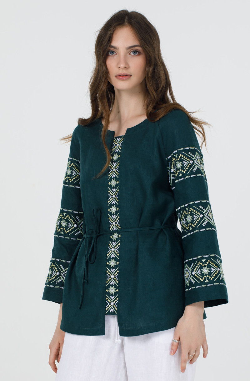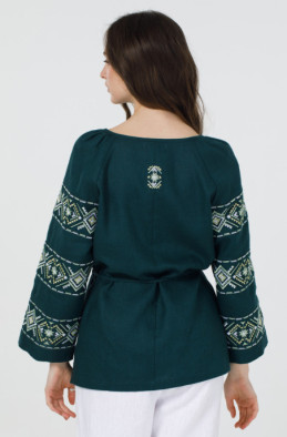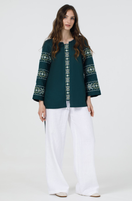 Блуза-туніка під пояс із лляної тканини. Рукав-реглан забезпечує хорошу посадку з фігури, з боків високі розрізи. Блуза без застібки.