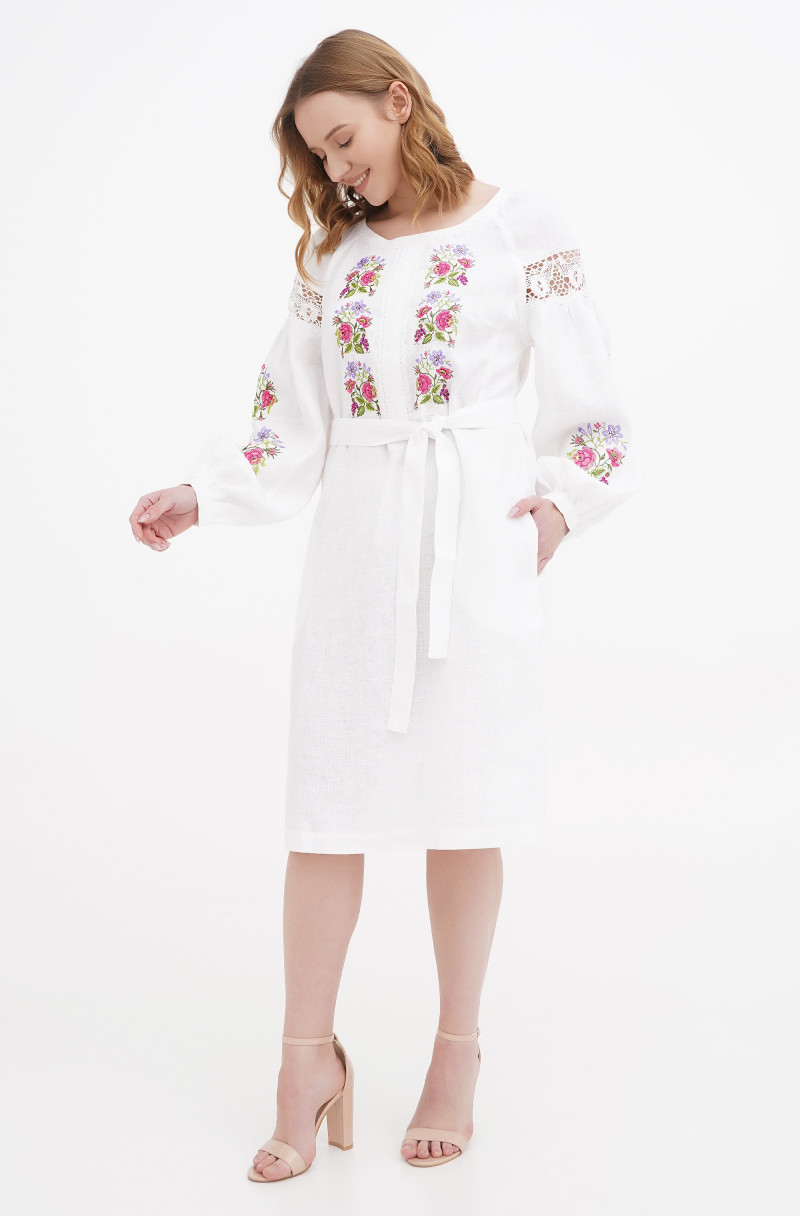Ошатна лляна сукня з вишивкою та мереживом. Силует напівприлеглий. У бічних швах є кишені, по спинці - застібка-блискавка.