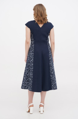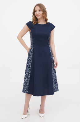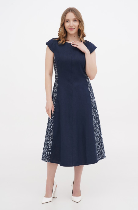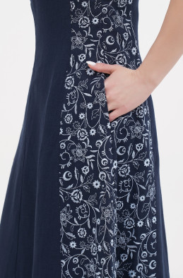 Лляна сукня Х-подібного силуету. Вертикальні рельєфи та боки, вишиті контрастним кольором, надають фігурі особливої стрункості. У бічних швах розміщена застібка-блискавка та кишені.